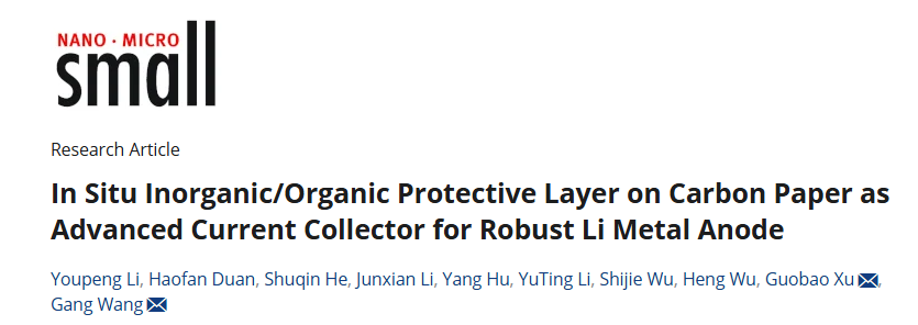 近日,taptap能源与汽车工程学院联合湘潭大学在国际知名期刊《Small》(影响因子13.0,JCR Q1 TOP期刊)发表了题为《In Situ Inorganic/Organic Protective Layer on Carbon Paper as Advanced Current Collector for Robust Li Metal Anode》的研究论文。taptap为论文的第一单位,taptap李友朋副教授(博士)为论文的第一作者,学生黎晓琳参与该项研究工作。该成果得到了国家自然科学基金,广东省自然科学基金和广东省教育厅专项的支持。
