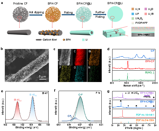 锂(Li)金属被认为是最有前途的下一代高能量密度电池的负极。然而,在循环过程中,不受控制的锂枝晶生长和无限体积膨胀严重阻碍了锂金属电池(LMBs)的应用。在这项工作中,作者针对三维碳纸(3D CP)亲锂性差以及3D CP空隙中Li不均匀沉积导致不稳定SEI层的断裂/再生,加速了电极/电解质界面副反应和循环寿命短的问题,采用热浸法在CP表面设计了由硝酸铋(Bi(NO3)3)和聚偏氟乙烯-六氟丙烯(PVDF-HFP)原位形成的无机/有机保护层(简称BPH)。一方面,亲锂Bi(NO3)3不仅提高了CP对Li的亲和性,而且在循环过程中转化为氧化锂(Li2O)、锂铋合金(Li3Bi)和含氮物质(Li3N,LiNxOy),提高了SEI层的机械强度和离子电导率。另一方面,原位转化的无机物镶嵌在PVDF-HFP中,可以有效地提高其对锂的化学稳定性,并适应长期循环过程中的界面波动,实现稳定的锂沉积/剥离行为。结果表明,BPH-CP在400次循环后其出库仑效率(CE)仍有99.7%。此外,使用BPH-CP@Li负极的LiFePO4电池在5 C高倍率下能够稳定循环超过3000次。更重要的是,即使匹配高载量LiFePO4(LFP,20 mg cm−2)或LiNi0.8Co0.1Mn0.1O2(NCM,16 mg cm−2)正极,也能稳定循环在100或150次,容量保持率分别为86.5%或82.0%。