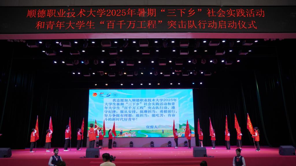随后,李天赠和邹兵兵共同为16支实践队伍代表授旗。全体突击队成员庄严宣誓,承诺以实际行动践行青春使命。各实践队伍将紧扣广东省“百千万工程”中心任务,围绕绿美广东、美丽乡村等专项,奔赴全省各地开展社会实践,展现顺职青年的责任与担当。