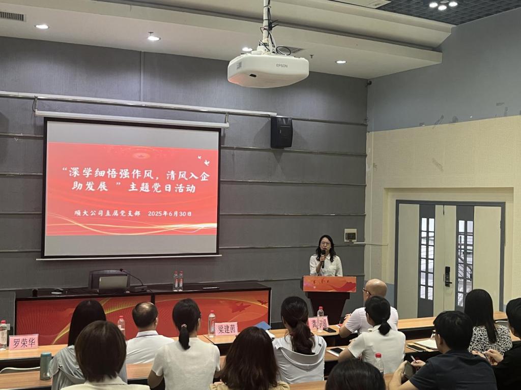 6月30日下午,为庆祝中国共产党成立104周年,不断推动深入贯彻中央八项规定精神学习教育走深走实,顺大公司直属党支部组织开展“深学细悟强作风 清风入企助发展”主题党日活动。顺大公司管理班子成员、全体员工参加活动。