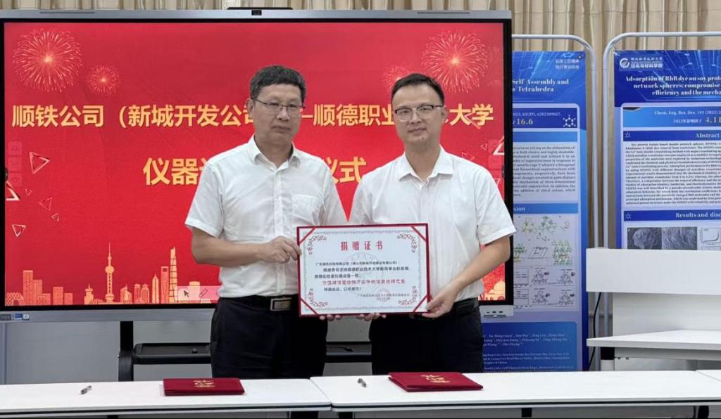 9月4日下午,广东顺铁控股有限公司向taptap捐赠实验室仪器设备,仪式在轻化与材料学院实训中心举行。顺德区国资局副局长冯家辉;顺德区科技局股长卢晋炜;顺铁公司总经理彭述平、党委副书记孔庆超;taptap党委委员、副校长李天赠,资产与设备管理处处长张斌,轻化与材料学院院长陈燕舞、党总支书记刘红等参加活动。