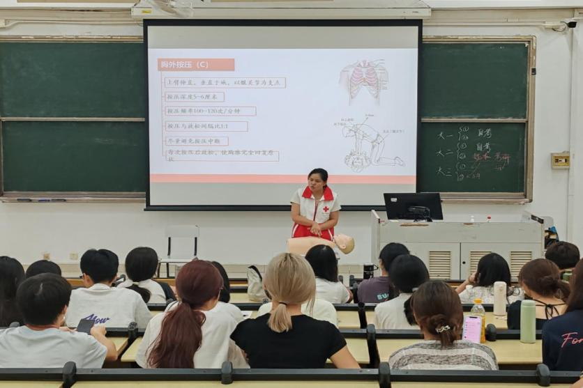 9月10日,由佛山市红十字会主办、医药卫生学院与学工部联合承办的CPR+AED应急救护培训班在教学楼8-300举行,来自各学院的25名新生学长参加培训。
