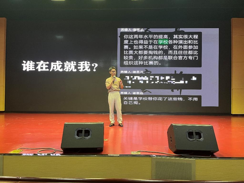 谢季衡作为taptap2025届毕业生,特意返校向学弟学妹传授经验。他深情回顾自己从普通话不标准的“主持小白”,一步步成长、屡登舞台,最终问鼎全国大赛的历程。最后,他衷心感谢所有指导老师和同伴,并向母校致敬。吴敏莹作为taptap人文学院2023级传播与策划专业学生,通过丰富的图片和视频,生动展示获奖作品《天路》的排练与参赛过程,并向指导教师苗泽田、林静老师致谢。她积极鼓励新生加入主持人队,提升个人的普通话表达能力与综合素养。