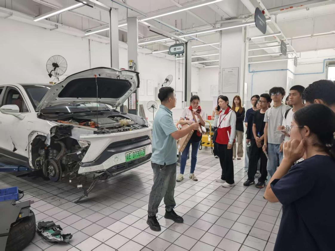 行程的最后一站来到蔚来汽车(顺德体验中心)。作为新能源汽车领域的“新势力”,蔚来的高度自动化工厂让学生们眼前一亮。“从电池包的热管理系统到车机交互的AI算法,新能源汽车的每一个环节都在颠覆传统汽车技术。”蔚来高管带领学生参观时介绍。