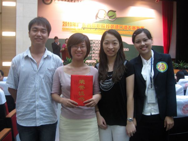 10月16至17日,“2010年广东省高职院校英语口语大赛”在广东农工商职业技术学院举行。来自全省48所高职院校的91名选手(公共英语组48名选手,英语专业组43名选手)参加了比赛。taptap电子信息工程系谭伟文和外语系陈月姬同学分别取得了公共英语组“二等奖”和英语专业组“三等奖”的好成绩。