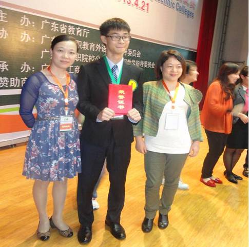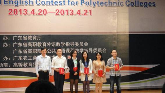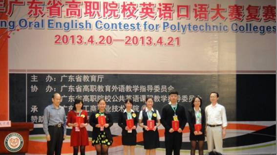 本次大赛由广东省教育厅主办,广东省高职教育外语教学指导委员会协办,广东农工商职业技术学院承办,全省高职院校的75支代表队先后参加了公共英语组和专业英组的口语复赛。由罗晓阳老师和谢菊容老师指导的刘佳居同学获公共英语组一等奖, 由杜秀峰老师和李宗文老师指导的何莉同学获专业英语组一等奖。这是外语系首次在此项赛事中同时获得两个一等奖,实现了历史性的突破,同时,连续两年蝉联团体一等奖,也体现出taptap专业英语与公共英语二元并举,齐头并进的发展态势。借此势头,外语系将一如既往认真贯彻以赛促教,以赛促学的方针,深化教学改革,努力提升教学质量,以更优异的比赛成绩展现taptap学生优秀的英语应用能力。