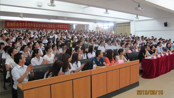 9月15日下午,外语学院开学典礼暨新生入学宣誓仪式在3栋300教室举行。外语学院相关负责人、英语日语教研室主任、辅导员、2013级各班班主任、优秀毕业生代表以及全体新生参加了本次活动。学校教务处负责人,督导室、教务处相关教师莅临指导。开学典礼由外语学院相关负责人主持。