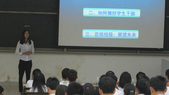 其次,化工学院4名学生干部代表进行发言。他们分别从“学生会主席是如何炼成的?”、“学生干部如何协调学习与工作的关系”、“如何做一名优秀的学生干部”及“如何坚持自己的梦想”等四个方面进行了分享。