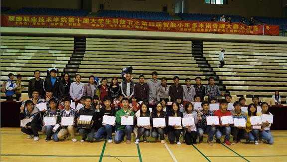在总决赛前,校团委、电信学院相关负责人,指导老师及全体辅导员都到现场进行指导,给了大赛莫大的支持和鼓励。在总决赛现场,气氛活跃,掌声不断,观众都为参赛队员的技能和创意欢呼呐喊。智能小车考验了学生单片机技术和编程能力,多米诺骨牌则考验了学生的创意和团队精神。各参赛队摆出形态各异,充满创意的骨牌造型,折服了全场观众,赢得一轮又一轮的惊叹和掌声!为增加此次大赛的科技含量、创新性、视觉感官性,特别邀请了佛山蓝飞翔电子实业有限公司及顺峰山航模乐园带来了精彩的飞行器表演,飞行器以高空360度旋转航拍,低空螺旋上升探月,演绎了一场华丽的飞行表演,赢得在场观众的阵阵惊呼和热烈掌声。最后来自电信学院domino荣获一等奖和最佳创意奖,机电工程学院小米队、电信学院蜗牛队荣获二等奖,外语学院Super. Machine队、人文社科学院红中一点蓝队、电信学院TSA队荣获三等奖。