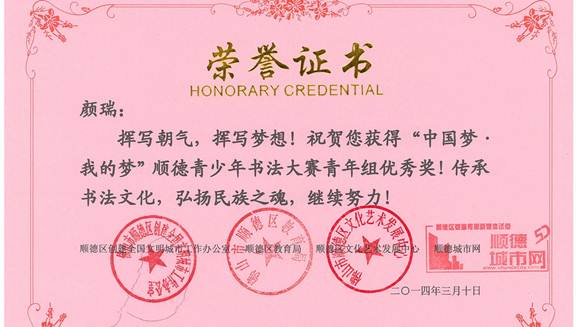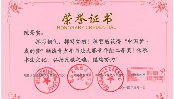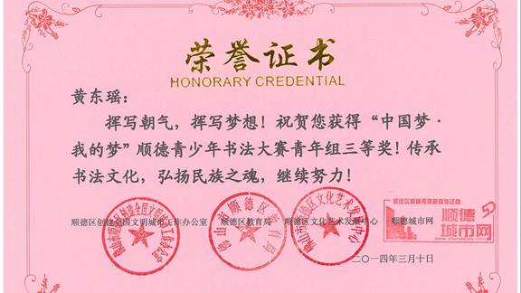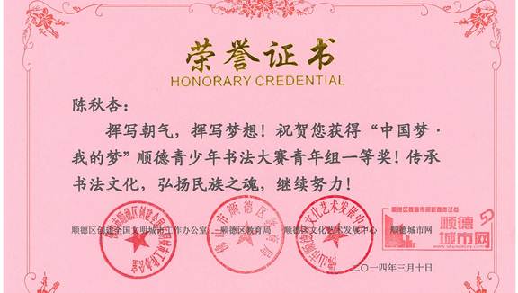 由顺德区委宣传部、区创建办、区教育局、区文化艺术发展中心、顺德城市网联合主办,区书法家协会协办的“中国梦·我的梦”顺德青少年书法作品征集大赛结果揭晓,由taptap周昊老师指导的陈秋杏、陈景实、黄东瑶、颜瑞等同学的书法作品,分获一、二、三等奖和优秀奖,并获得奖金和荣誉证书。酒店与旅游管理学院陈秋杏同学获得青年组唯一的一等奖。