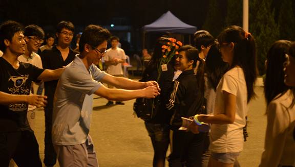 在悠扬的歌声中,活动达到高潮。来自不同学院的男生女生通过游戏促进友谊,现场气氛十分融洽,同学们的欢声笑语在交流晚会现场飘荡着,回响着,也让来自各个学生干部建立了深厚的友谊!