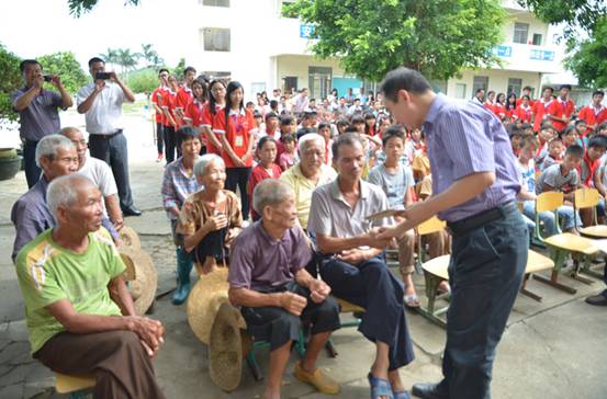 紧接着,经济管理学院团委负责人将价值十几万的爱心企业家的捐赠物资交给了村委书记以及分界小学校长,并与团市委副书记一起向分界村的孤寡老人送去慰问金。