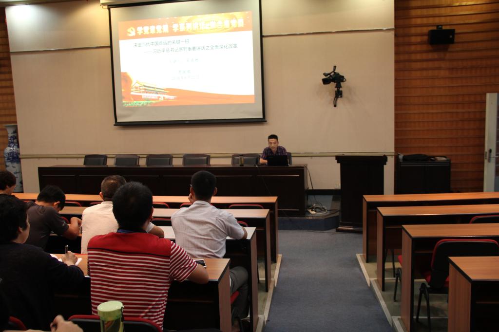 为贯彻落实“两学一做”学习教育,深入学习领会习近平总书记关于理想信念、“中国梦”、“四个全面”战略布局和五大发展理念等方面的新观点、新思想和新论断,6月22日下午,行政二党总支邀请了学校“两学一做”讲师团吴浩然老师为行政二党总支全体党员主讲了题为“决定当代中国命运的关键一招——习近平总书记系列重要讲话之全面深化改革”的讲座。讲座围绕习近平总书记系列讲话,从打破“两个凡是”到“蛇口模式”再到“一带一路”倡议,展现了我国走出中国特色社会主义道路、确定了社会主义制度、形成了中国特色社会主义理论体系的三大成就,对国家全面深化体制改革进行了详细介绍,并对改革的背景、战略部署以及重点难点进行了深入浅出的解析。通过此次学习,大家对国家全面深化改革的路线图有了更加清晰的了解,对改革的策略有了更加系统的认识,也进一步增强了党员的进取意识、机遇意识和责任意识。