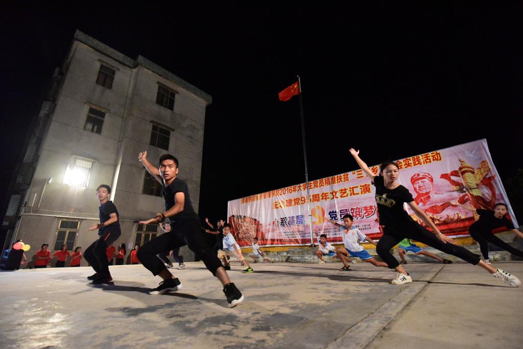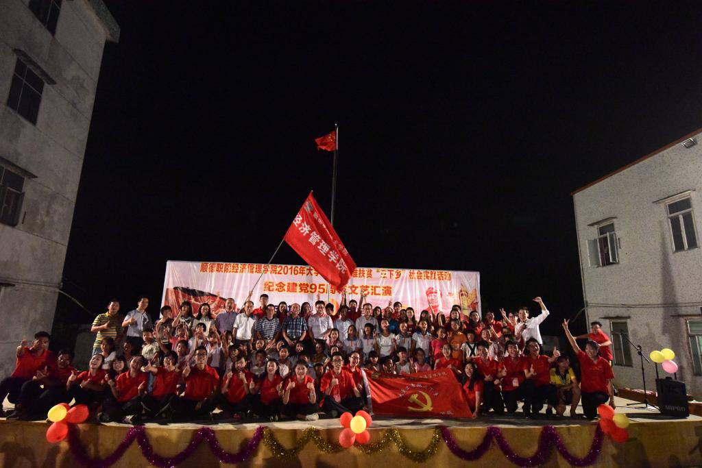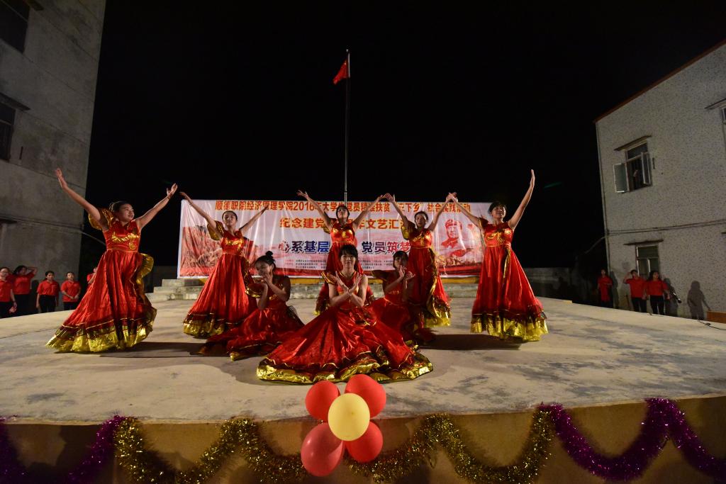 为庆祝中国共产党成立95周年及长征胜利80周年,贯彻落实《关于开展2016年广东省大学生助力精准脱贫“三下乡”专项行动的通知》的文件精神,7月29日晚,经济管理学院“党员筑梦”精准扶贫社会实践团在湛江市遂溪县分界小学举行了以“心系基层,党员筑梦”为主题的文艺汇演。