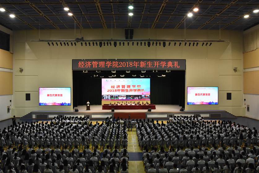 10月8日晚上,经济管理学院2018年新生开学典礼在梁銶琚礼堂隆重举行。校督导室徐清才主任、彭炳初副主任、刘元根教授,校团委张业华书记,经济管理学院高钧院长、党总支刘红书记,经济管理学院全体中层干部、班主任、辅导员老师以及全体18级新生近1200人出席本次活动。
