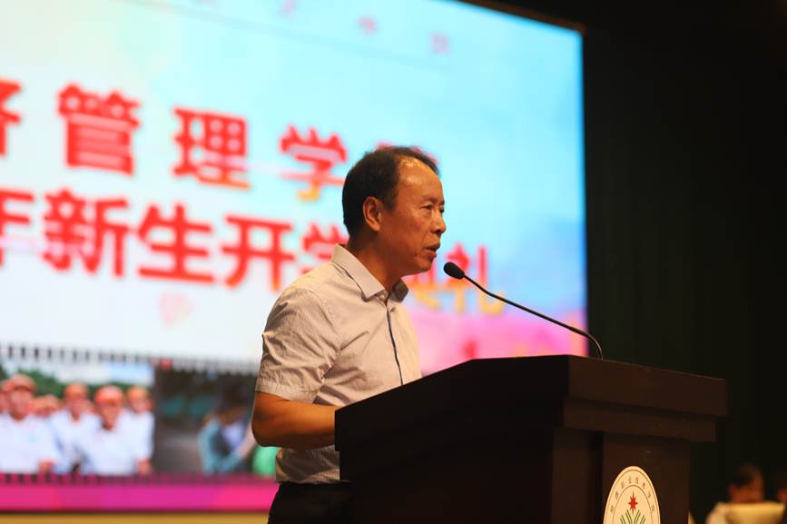 校督导室徐清才主任发言,他告诉同学们,课室、图书馆、体育场是大学生应该常去的三个地方;他勉励大家明确目标、勤奋好学、强健身心、勇于实践,发挥创新思维,追求美好梦想。