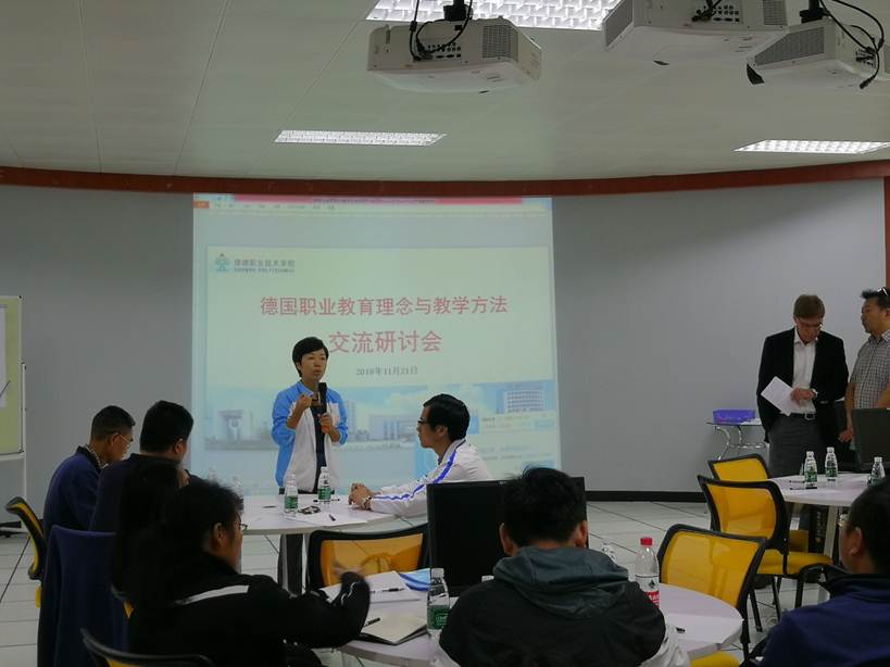 22日上午,召开德国职业教育理论与教育方法交流研讨会上,学校副校长罗丹、组织人事处(教师发展中心)、教务处负责人、各二级院系院长、教学副院长、全体教学督导,以及参加培训的教师代表40余人,聆听了奥特教授关于《新学习文化4.0》的主旨演讲,研讨会上与会领导和老师们就向以学生为中心的教学理念转变、教学组织实施和检查评估等多方面进行了积极的分享和研讨,为部门联动推进课程教育理念转变和教学方法改革,提出了宝贵的意见和建议。