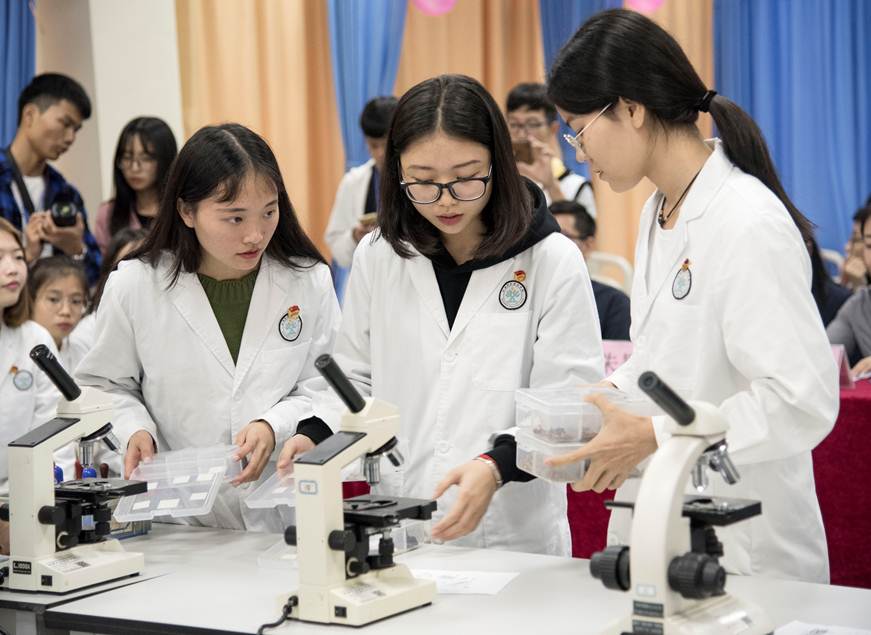 结合药学专业的特色,同学们还展示了“显微镜观察微生物”的实验,让现场师生观察显微镜下微生物的结构、动态,同时向我们展示了人体寄生虫蛔虫、钩虫等标本,让现场师生惊叹连连。