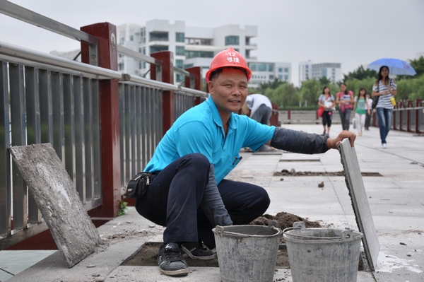他,中等个子,健壮的体魄;他,寡言少语,眼神中充满从容和坚定;他,酱紫色的皮肤,穿着多处磨损却洗得发白的工作服,不熟悉的教工都把他误认为是建筑工地的民工;他就是足迹遍布校园每个角落,专门负责校园校道、广场、房舍等基础建筑设施的小修小补工作,总务处修缮科的一名泥水工——严雄辉同志。