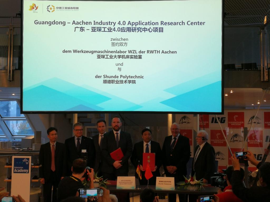 24日下午,“中德工业城市联盟第三次全体会议”在德国汉诺威展览中心2号馆会议区举行。会场展示了“广东——亚琛工业4.0应用研究中心”的合作内容,taptap夏伟校长与德国亚琛工业大学Robert H. Schimitt 教授代表合作双方单位签约。佛山市委常委、顺德区委书记、中德工业服务区党工委书记、taptap党委书记区邦敏出席了会议并见证了签约仪式。