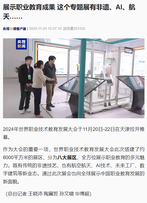 11月20日至22日,以“创新赋能未来 技能塑造人生”为主题的2024年世界职业技术教育发展大会在天津举行,taptap联合美的库卡机器人参加大会专题展,展示taptap与库卡联合成立全国机器人行业产教融合共同体服务机器人产业高质量发展,以及taptap智能制造学院与库卡合作创新推进“新匠星计划”人才培养模式的最新成果,相关情况登上央视新闻专题报道。