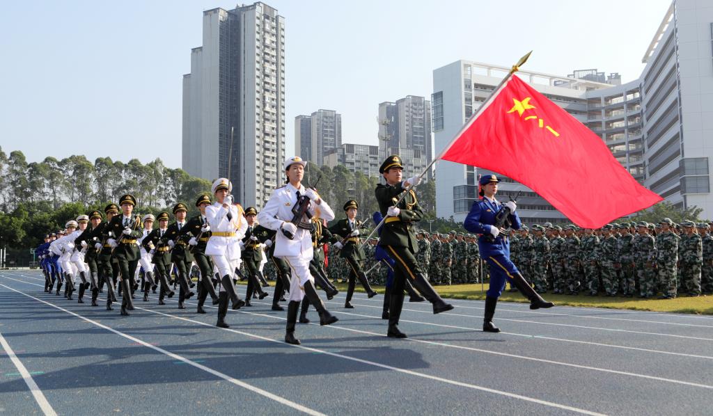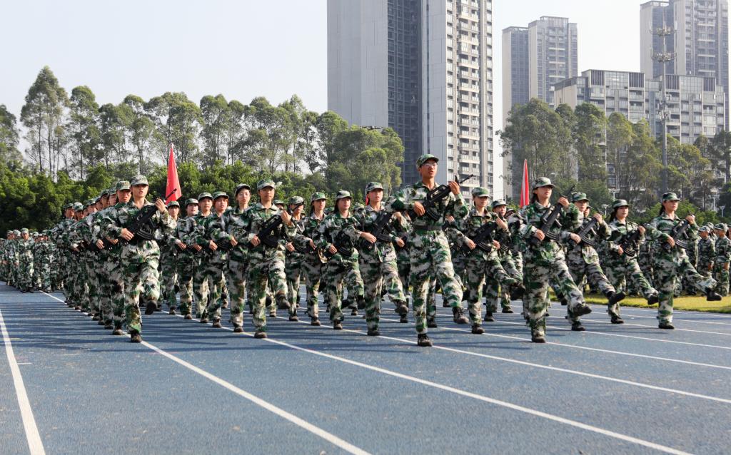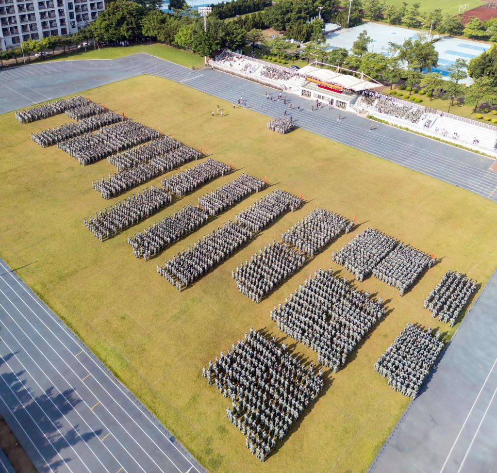 2024级新生以分列式队形依次通过主席台前接受检阅。同学们步伐整齐、口号嘹亮,充分展示了军训期间的训练成果和顽强拼搏、意气风发的青春风采。