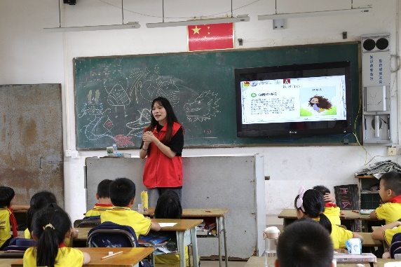 “五月五,是端阳。门插艾,香满堂。吃粽子,洒白糖。龙船下水喜洋洋。”在新兴县东成镇云河小学传出郎朗诵读声,这是一节以“吟诵爱国诗章 弘扬传统文化”为主题的普通话推广课程。突击队队员们以即将到来的端午节为契机,通过讲述端午节的历史起源、风俗习惯和文化内涵,带领孩子们感受中华优秀传统文化的魅力,引导大家树立文化自信心和民族自豪感。近200名孩子在诵读端午诗歌的过程中逐渐产生了对中华优秀传统文化浓厚的兴趣和敬意。