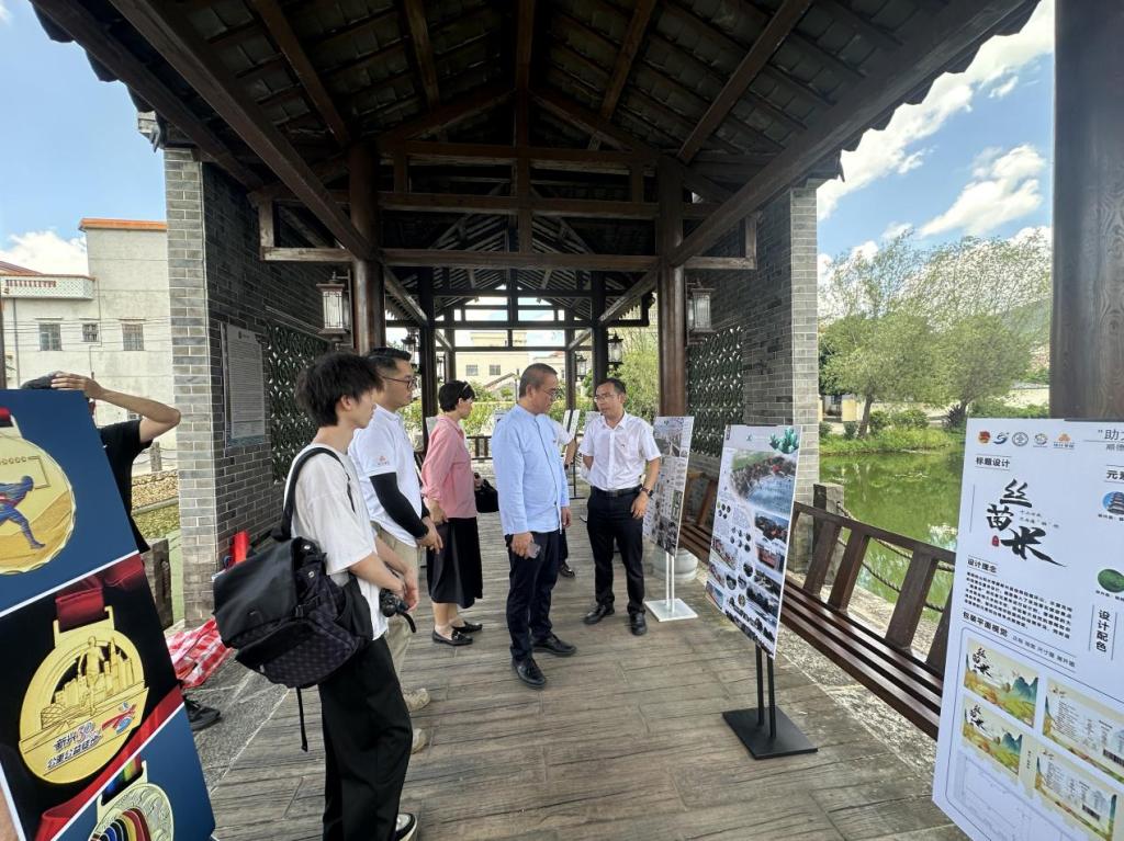 随后,一行人前往天堂镇朱所村,围绕当地环境改造需求、农业观光生态研学体验园实地调研考察,并将前期已为当地完成的建筑改造、公益徒步活动奖牌及徽标、农产品包装等设计效果图在朱所村小广场展出。