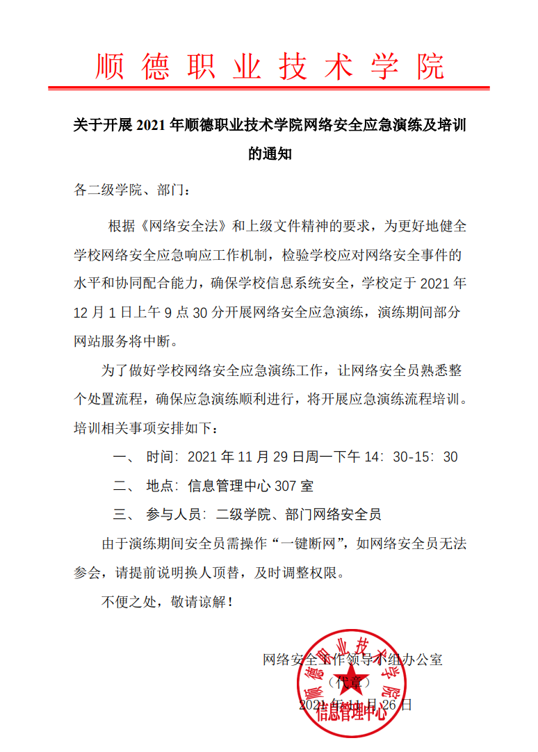 关于开展年顺德职业技术学院网络安全应急演练及培训的通知